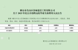 雅安市名山區茶城建設工程有限公司系雅安市名山區區屬一級國有企業,成立于2018年,注冊資本2億元,主要經營范圍為對土地、城市資源等領域及保障性住房、房地產開發、城市基礎設施、公共服務設施等進行經營管理;并開展項目投資、工程管理服務及園林綠化、環境治理、土地整理等各類工程建設活動。根據公司2022年人員招聘計劃,茶城公司及全資子公司擬面向社會公開招聘高校畢業生3名(含2020年、2021年未就業高校畢業生和2022年應屆高校畢業生。特別說明:“未就業高校畢業生”需同時滿足以下條件:拿到畢業證和學位證;在規定擇業期內沒有與任何單位簽訂任何形式的勞動合同...