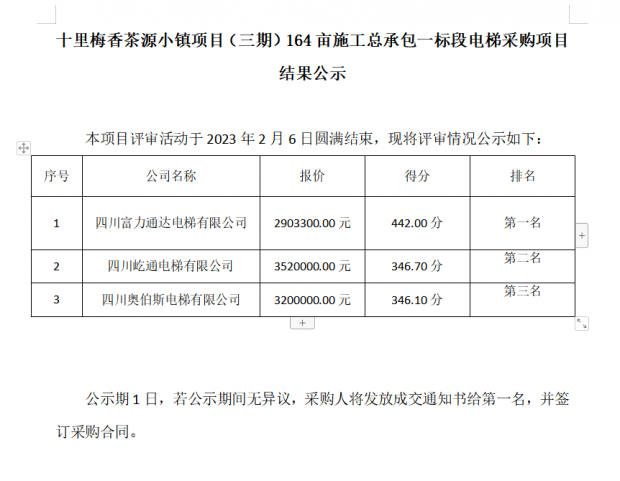 十里梅香茶源小鎮項目(三期)164畝施工總承包一標段電梯采購項目 結果公示