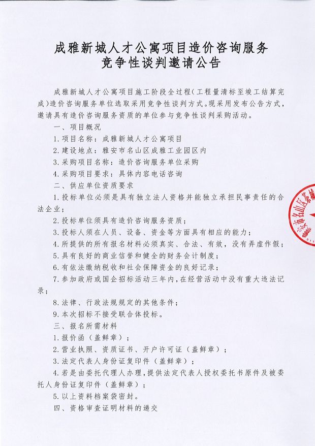 成雅新城人才公寓項目造價咨詢服務競爭性談判邀請公告